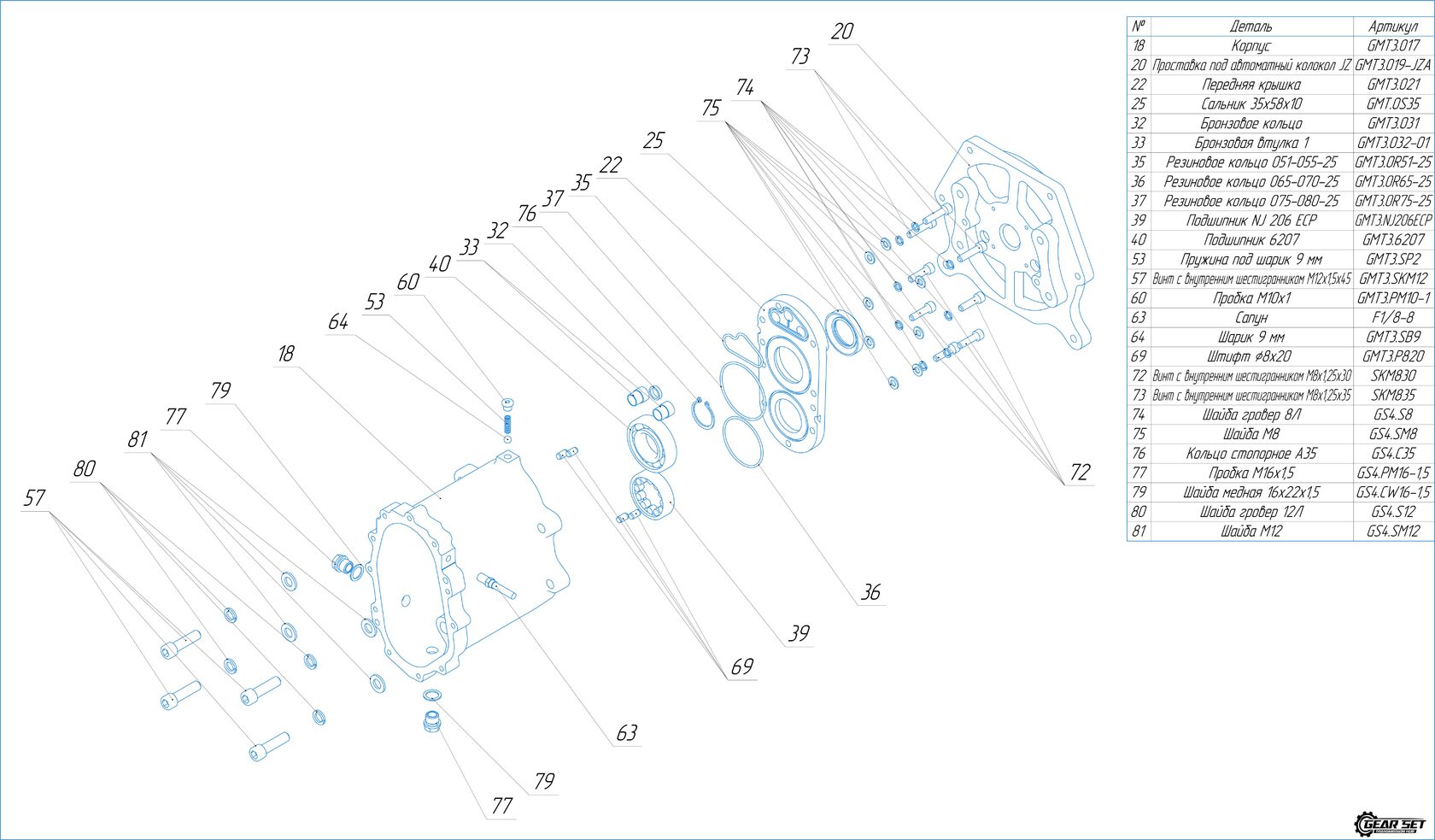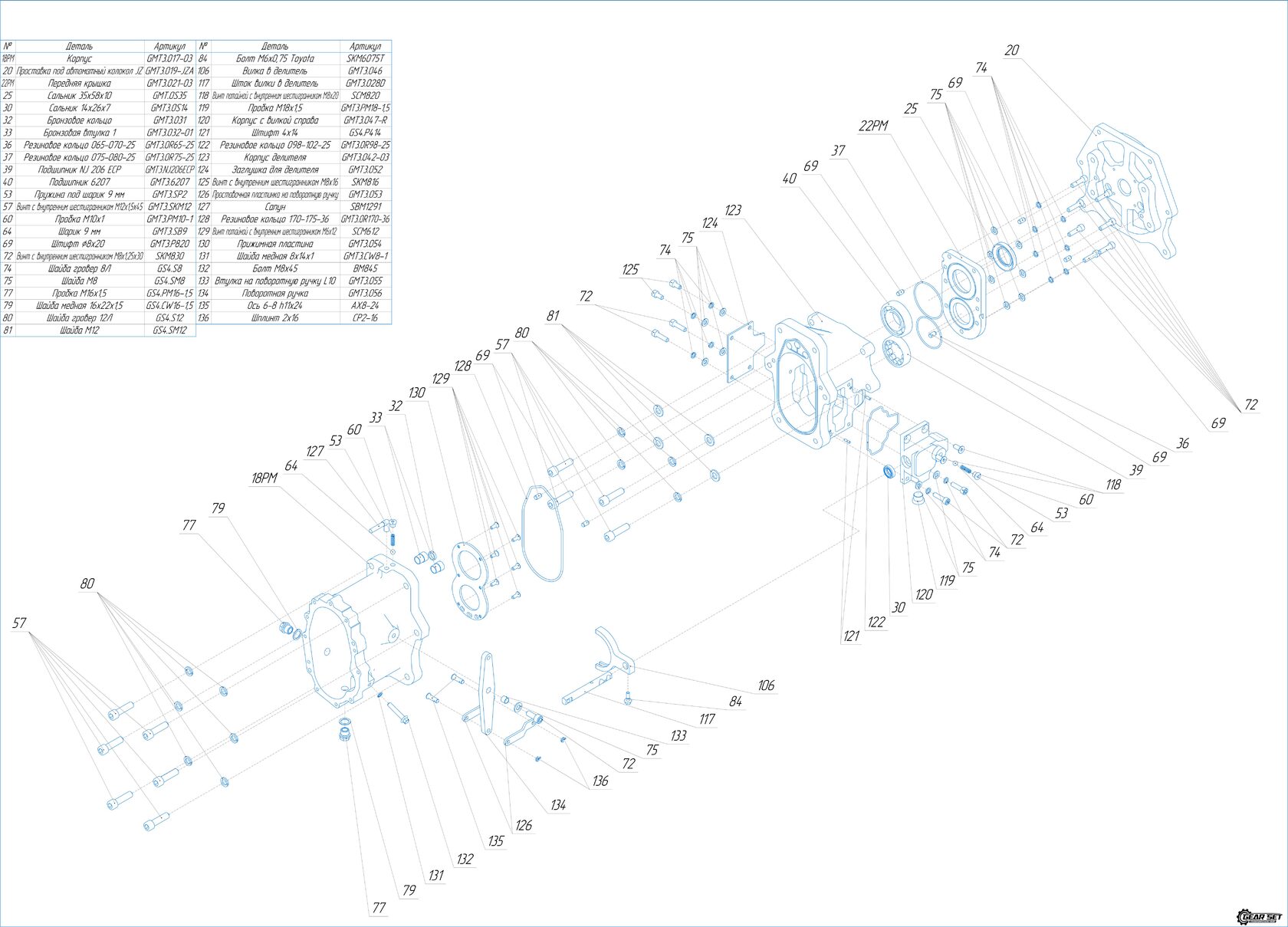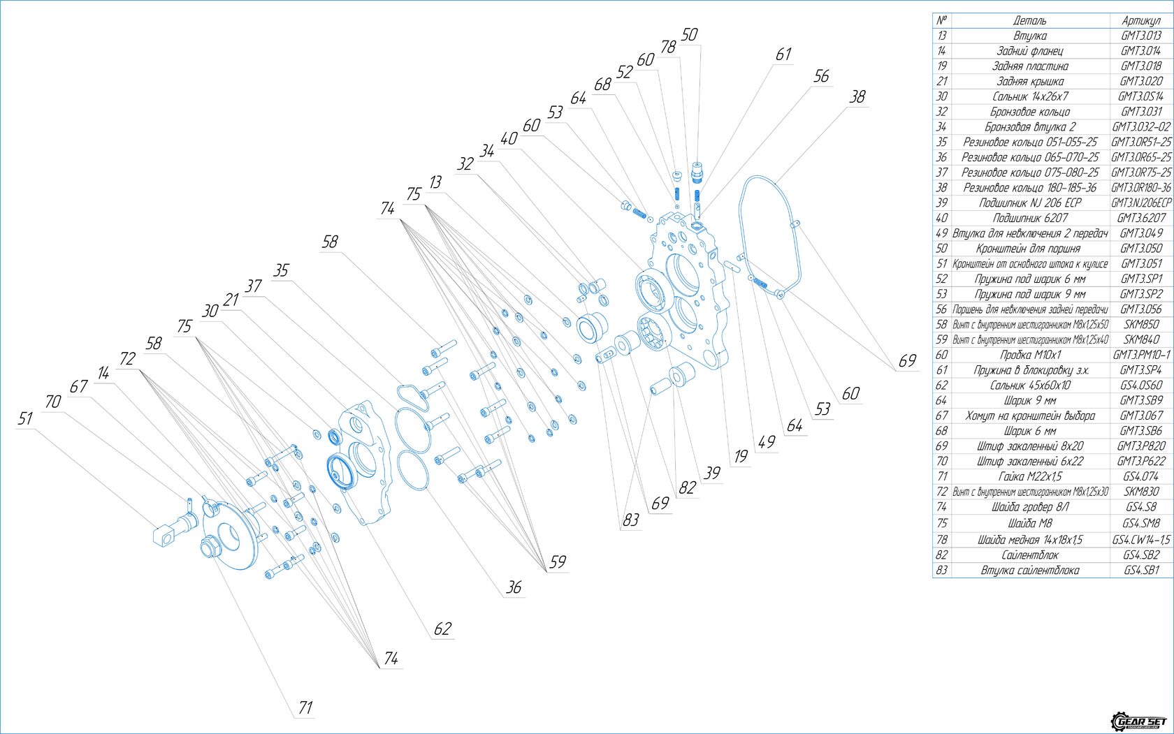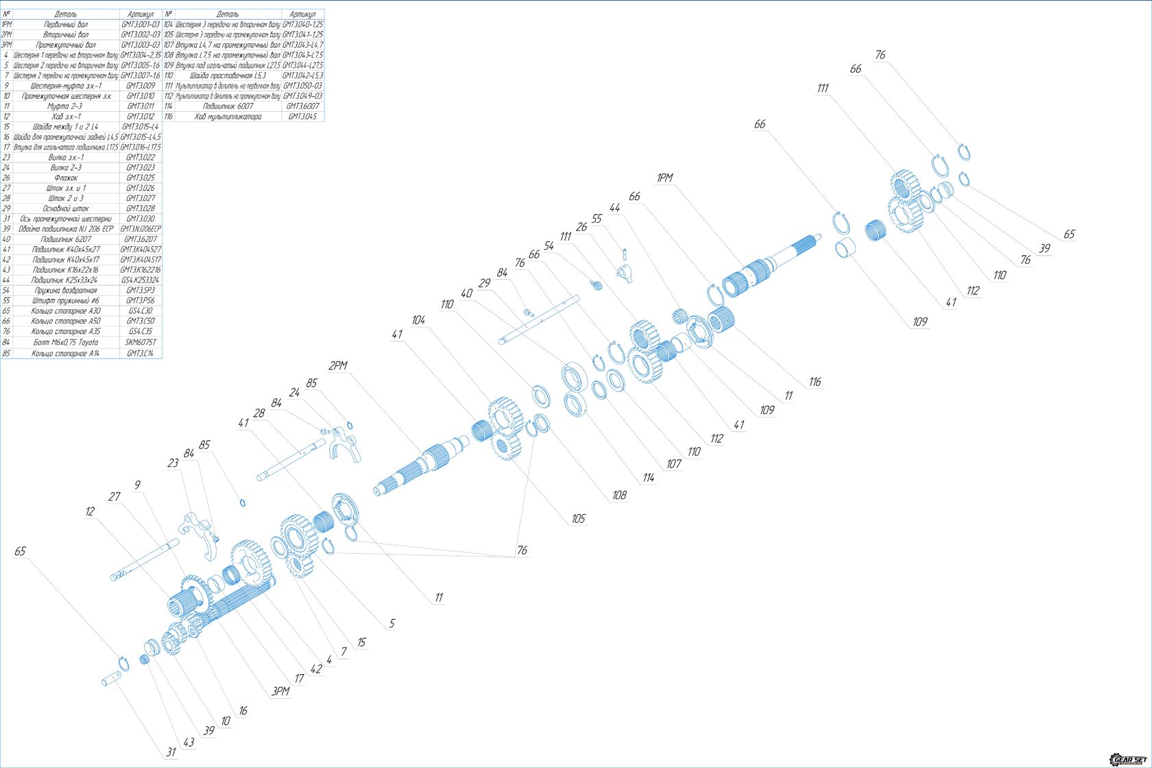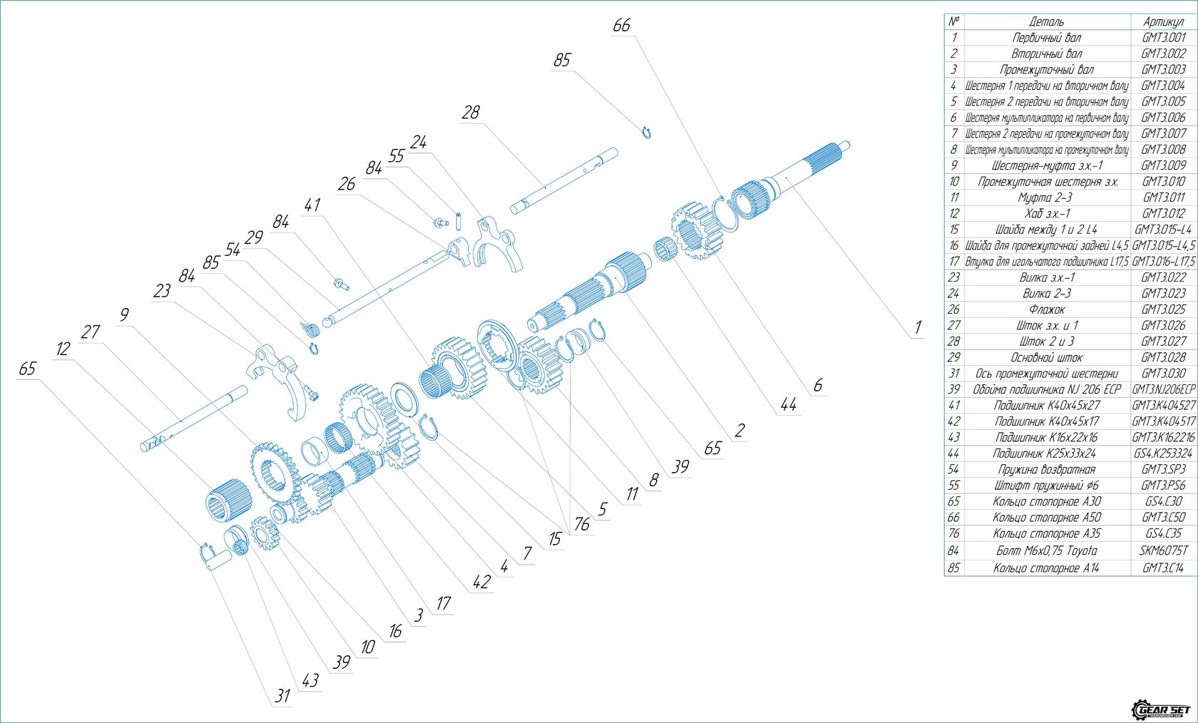 Использование прямой передачи и компактные размеры позволяют оставить только два ряда подшипников в передней и задней плите кпп без добавления промежуточной пластины подшипников. Более 80% нагрузки будет уходить на прямую передачу, при работе которой шестерни не участвуют.